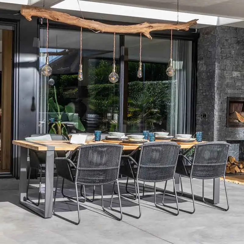 Experience the pinnacle of garden furniture design with this luxurious all-weather dining set, boasting six stylish rope accor dining chairs and a stunning alto table adorned with a natural teak slatted top and robust anthracite aluminium legs. Designed to age gracefully, the table's silver grey patina adds to its charm over time.