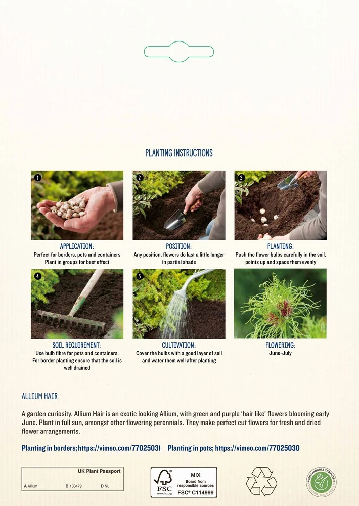 A garden curiosity. Allium hair is an exotic looking Allium, with green and purple ‘hair like’ flowers blooming early June. Plant in full sun, amongst other flowering perennials. They make perfect cut flowers for fresh and dried flower arrangements.