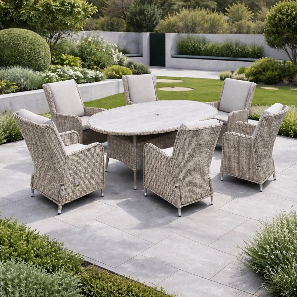 Make the most of your outdoor dining with the Athens 6-Seater Oval Dining Set - a perfect blend of classic style, modern functionality, and ultimate comfort. Ideal for gardens, patios, and terraces, this set includes a spacious Oval table, six high-back reclining chairs making it effortless to host family meals, alfresco dinners, or social gatherings. Complete with a parasol and base , it offers shade, style, and convenience for any outdoor occasion. With its timeless rattan-effect weave, plush weatherproof cushions, and elegant neutral palette, the Athens set combines sophisticated design with all-weather practicality, delivering a premium outdoor dining experience that lasts season after season.