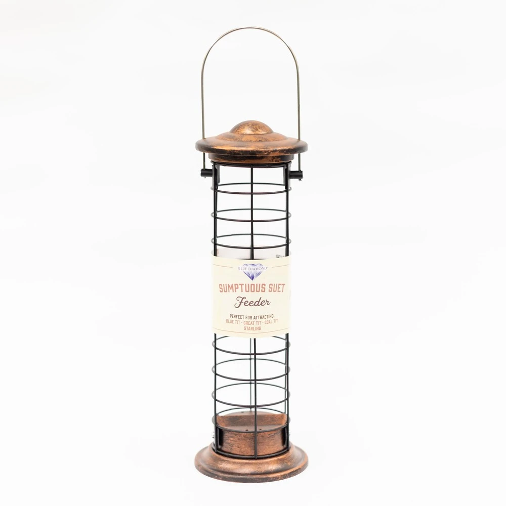 Our premium quality suet feeder is made from cast aluminium and has a brushed copper finish. The base of the feeder can be easily removed for cleaning and the simple flip-top lid allows for easy refill. We recommend Blue Diamond Sumptuous Suet Puddings or Indulgent Suet Nuggets, perfect for attracting Blue Tit, Great Tit, Coal Tit, Starlings and more.
