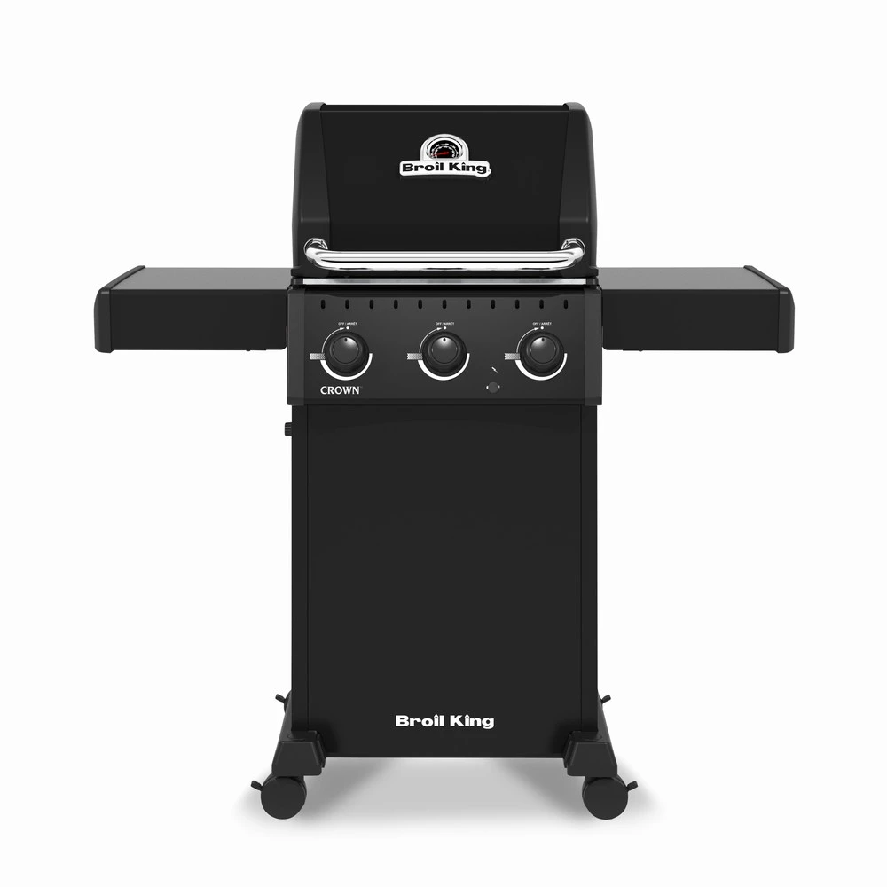 The Crown™ 300 series features features 2,258 sq. cm primary cooking surface and includes 3 stainless steel Dual-Tube™ burners, cast aluminum cookbox, reversible heavy-duty cast iron cooking grids, stainless steel Flav-R-Wave™ cooking system, and electronic ignition. The 300 classic series features black powder coat drop down side shelves, sturdy cart base with black powder coat front panel.