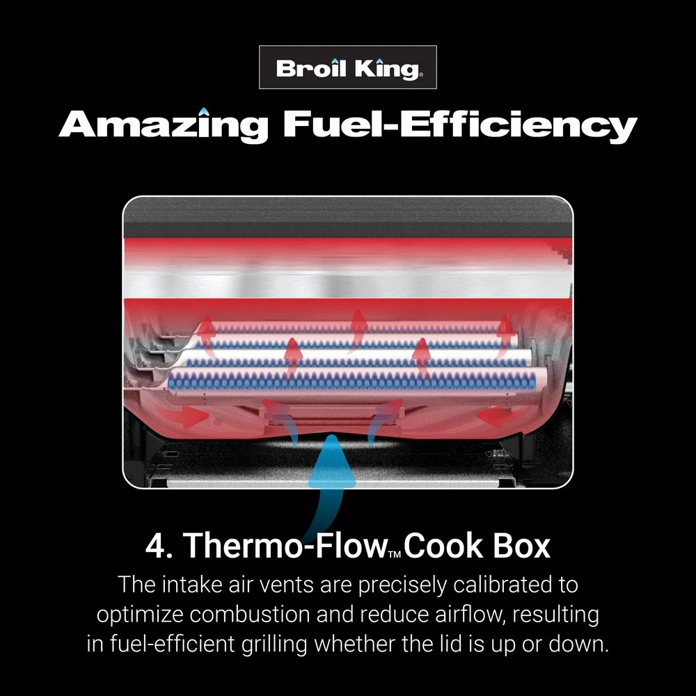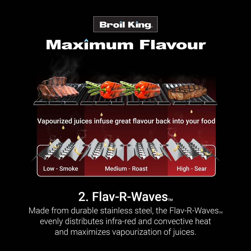 Designed for performance, versatility and great value. The Crown™ series offers performance and versatility with a contemporary look. Broil King’s cooking system features Flav-R-Cast™ Iron cooking grids to sear the perfect steak. They can also be angled to channel excess juices away and avoid any flare-ups. The stainless steel Flav-R-Wave™ vaporizes juices and infuses them back into your food for great flavour. Powerful side-ported dualflame tube burners provide twice the amount of heat per burner. The versatile Crown™ series is designed for performance and great value.