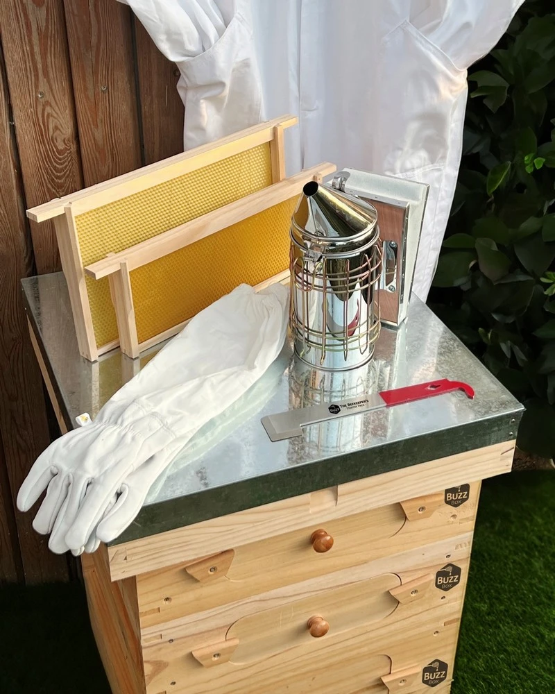Buzz Box is an all-in-one starter kit designed for new beekeepers. It includes everything a person needs to get into beekeeping – apart from the bees!