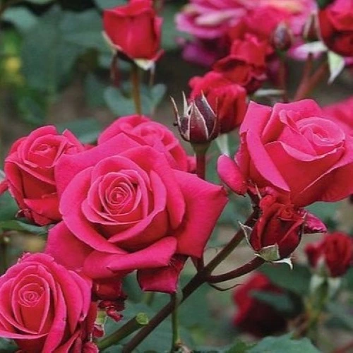 - Sumptuous, gorgeous, rich red buds opening to a deep pink. Upright, strong growth.