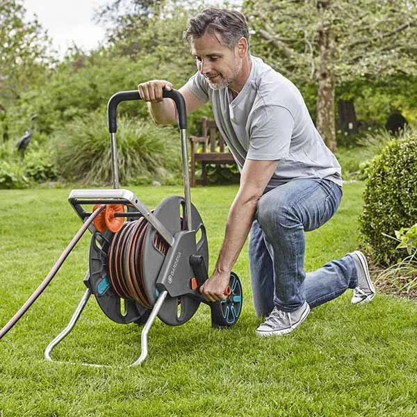 The GARDENA CleverRoll Hose Trolley L Easy set is ideal for large gardens. It comes as a fully assembled ready-to-use set complete with a 50m hose, and all the hose connectors required, including a spray nozzle. This robust model features maximum stability with a foldable supporting foot, and a convenient hose guide for easy, mess-free hose rewinding.