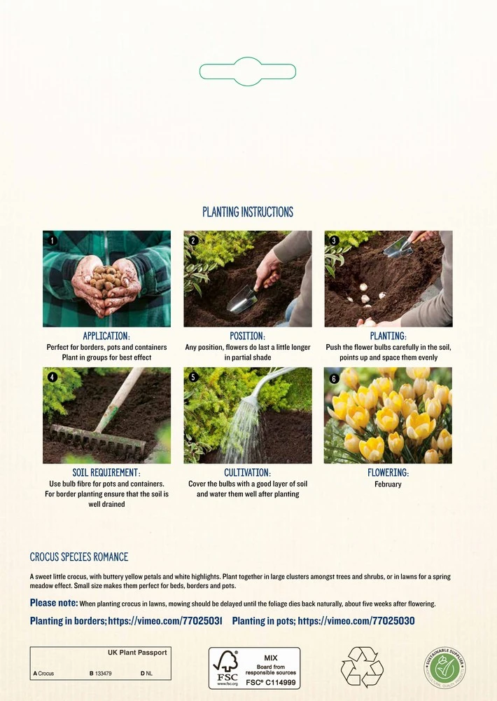 A sweet little crocus, with buttery yellow petals and white highlights. Plant together in large clusters amongst trees and shrubs, or in lawns for a spring meadow effect. Small size makes them perfect for beds, borders and pots.