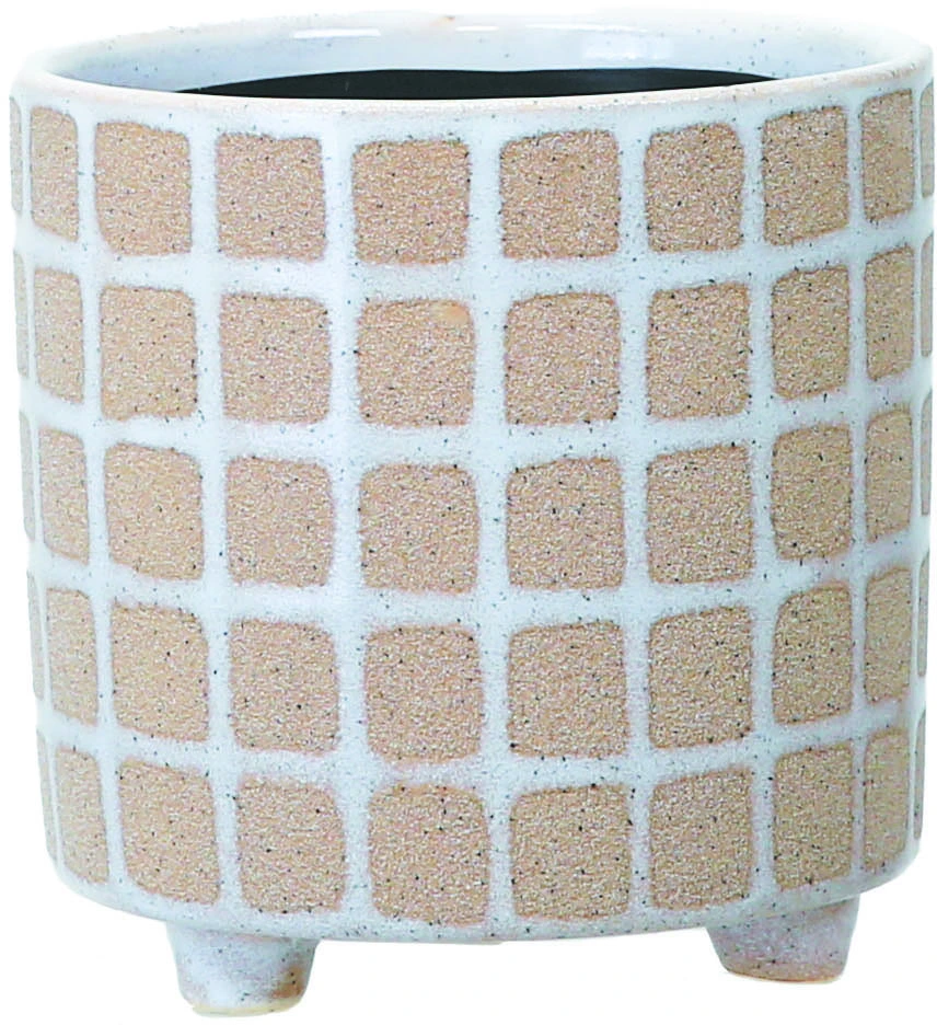 A textured pot with a contemporary grid pattern in a neutral tone.