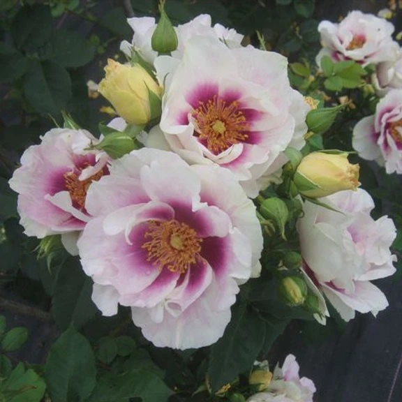 - Large clusters of pale mauve-pink, almost white flowers with purple eyes. Compact growth.