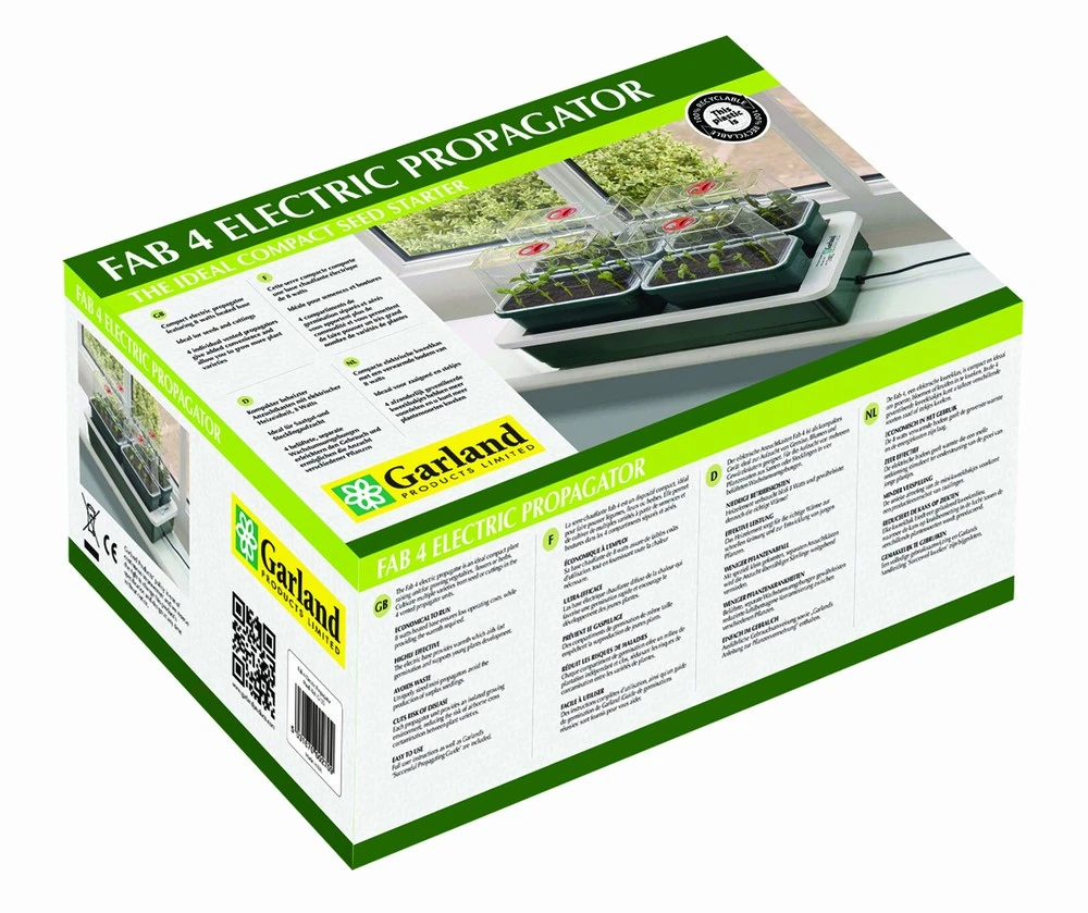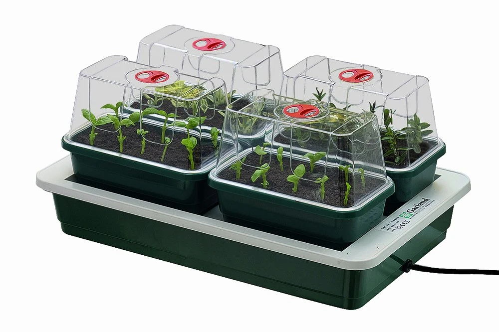 - Designed for the keen gardener looking to grow a range of seed varieties. The size of the electric heated base lends itself to use in a greenhouse or on a spare room table top. Featuring 4 independent small vented propagators which allow for added user flexibility, each 23cm (9") Long by 17cm (6.5") Wide.The propagator units are ideal for growing seeds in volume and particularly suited to larger cuttings. The heated base contains a 10 Watt carbon fibre element for even heat distribution. This unit is not thermostatically controlled and is designed to increase the ambient compost temperature by around 8° Centigrade.Size Check: 38.5cm (15”) Long 24cm (9.5”) Wide 17.5cm (7”) High