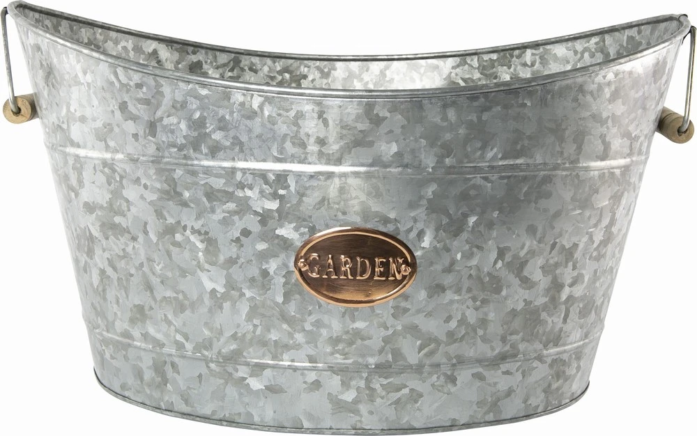 The Galvanised planter is strong and durable yet lightweight and easy to move. The planter has a modern mottled antique finish with wooden side handles and copper emblem.