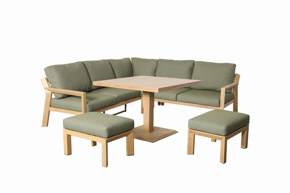 Designed with a beautiful wood-look finish that captures the charm of natural timber - without the maintenance - this contemporary set with All-weather cushions and height adjustable table combines relaxed comfort with smart functionality. Perfect for patios, balconies, and smaller gardens, it offers a compact footprint without compromising on style or dining space. Turn your outdoor space into a tranquil sanctuary with the natural wood-look charm and compact elegance of the Hudson Mini Corner Dining Set. Designed for modern alfresco living, it’s the perfect choice for smaller spaces that still deserve big style.
