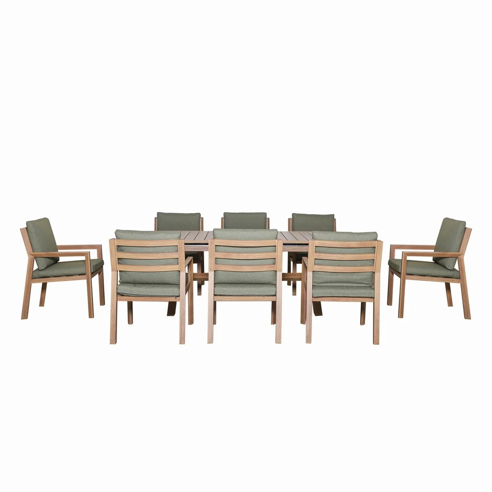 Designed for effortless alfresco living, this versatile set features a smooth-glide extending table that transitions in seconds—perfect for family dinners, summer gatherings, and outdoor entertaining. Crafted with a premium wood-foil finish, the Hudson collection captures the authentic grain and charm of real timber without the sanding, staining, or oiling. Paired with plush all-weather cushions in a fresh green tone, this set brings together durability, comfort, and timeless style for year-round enjoyment.