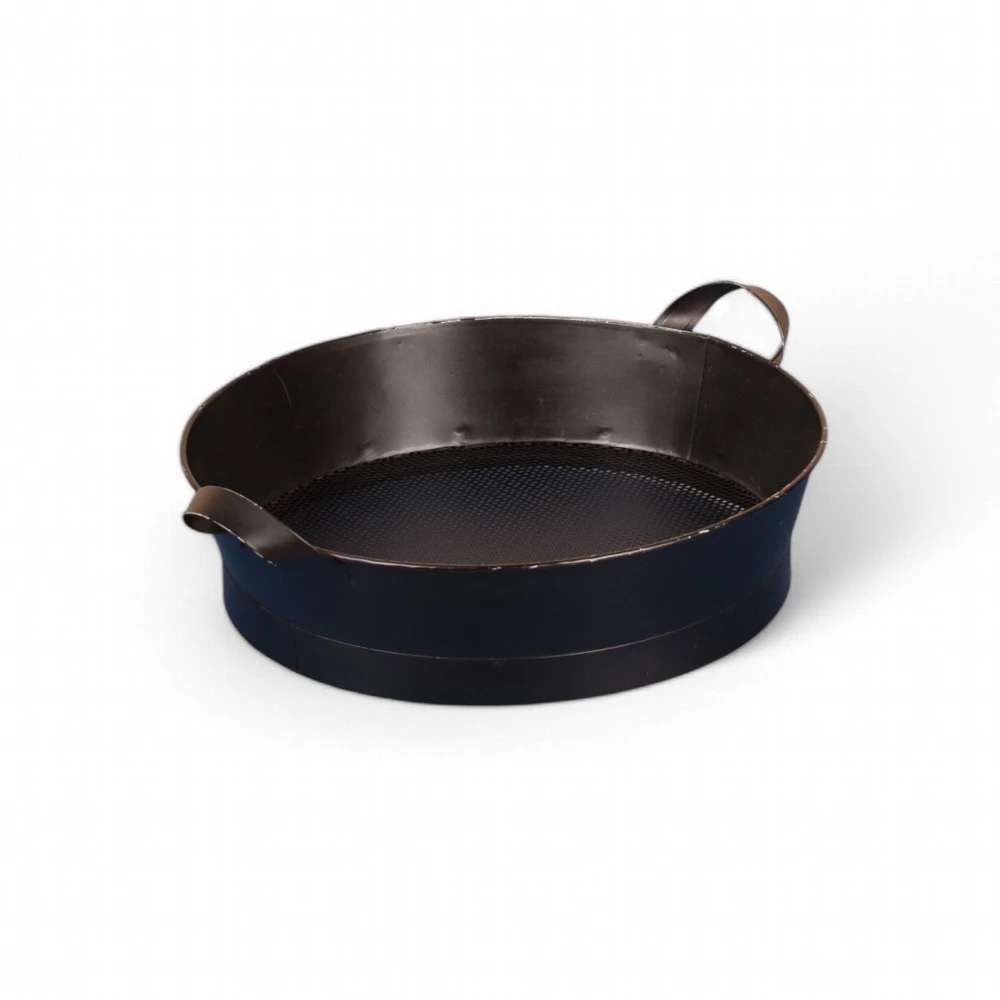 The Kadai Riddle is an essential for keeping your firepit healthy and burning all year round. This Kadai Riddle is used to clean the beads inside your Kadai Fire Pit by simply adding the Beads to the Riddle, sieving and returning to your Kadai. We recommend periodically cleaning the Kadai Beads using the Riddle, it is effective for removing excess ash and will improve the drainage of your Kadai BBQ. Kadai Riddle made in mild steel. L43cm W35.5x H9.5cm Compatible with Kadai Beads.