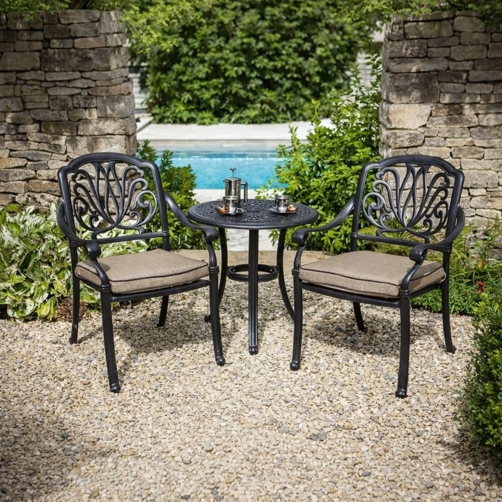 Create a charming, traditional retreat in your outdoor space with the Kingston 3pc Bistro Set — a beautifully crafted cast aluminium bistro set designed to bring timeless elegance and year-round durability to your garden, patio, or balcony. With its exquisite hand-crafted detailing and classic styling, this set transforms any corner into a relaxing spot for alfresco dining, morning coffees, or evening drinks outdoors. Combining heritage-inspired design with modern, low-maintenance materials, the Kingston Bistro Set offers the perfect blend of style, comfort, and practicality. Lightweight yet exceptionally durable, it delivers all the charm of traditional outdoor furniture with none of the upkeep.