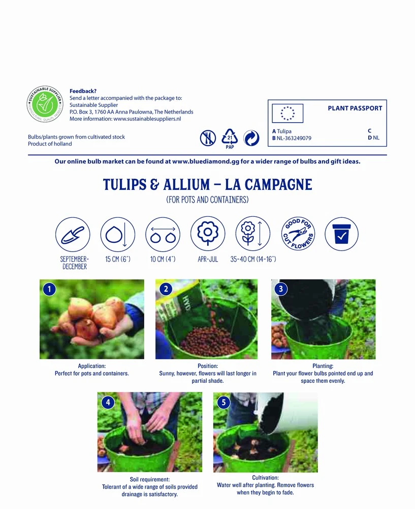 A French inspired collection containing Tulip Foxtrot, Tulip Blue Diamond and Allium Christophii