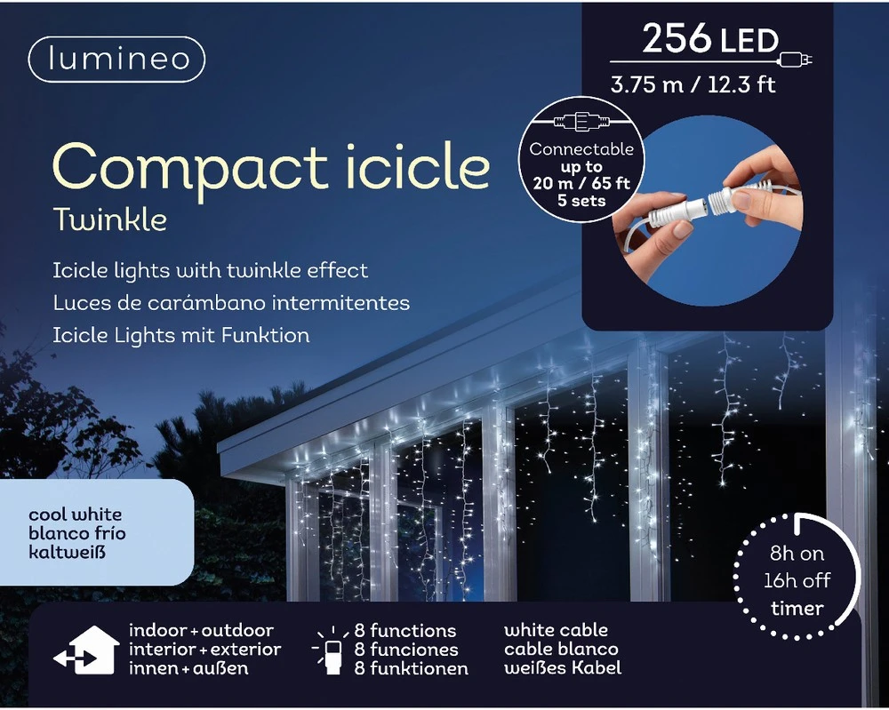 LED Icicle lights with 8 functions, including a twinkle effect.