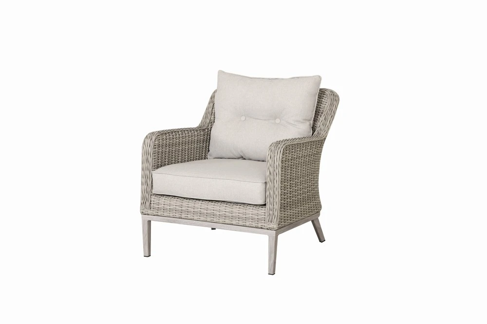 Featuring softly tapered legs and a side table finished in a wood-look foil, you’ll enjoy the warmth and beauty of natural timber - without the sanding, staining, or ongoing maintenance. The chairs are dressed in soft ivory all-weather cushions with a chic double-button detail, nodding to classic mid-century style. Crafted in a pale grey wicker weave, blending full round and half round strands, the design achieves a premium texture that feels both timeless and fresh.