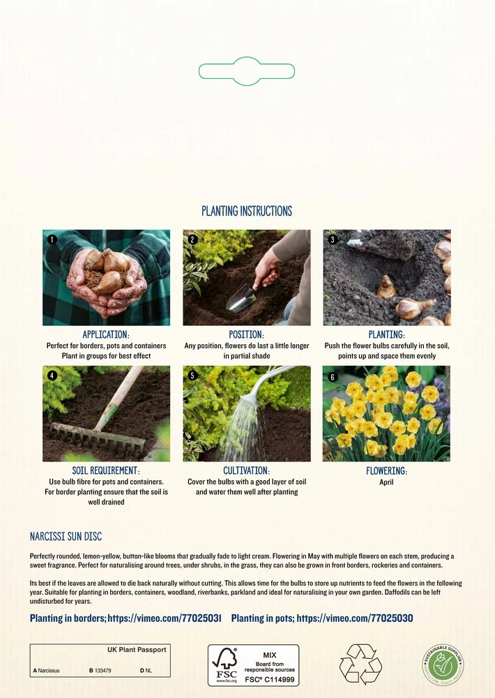 Perfectly rounded, lemon-yellow, button-like blooms that gradually fade to light cream. Flowering in May with multiple flowers on each steam, producing a sweet fragrance. Perfect for naturalising around trees, under shrubs, in the grass, they can also be grown in front borders, rockeries and containers