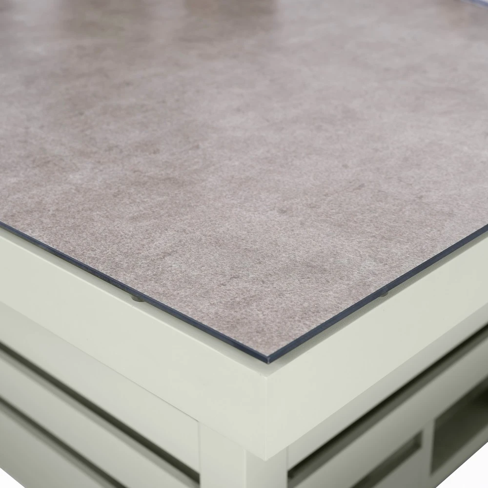 Finished in a calming olive green, this premium set brings together modern design, exceptional comfort, and incredible versatility — perfect for everything from relaxed lounging to elegant alfresco dining. The spacious adjustable-height table shifts effortlessly from a casual coffee table to a generous dining setup, making it ideal for morning coffees, family gatherings, or summer dinner parties. Its durable muted grey-beige ceramic glass top delivers a sleek, sophisticated look, while two matching benches provide ample seating for guests. For next-level relaxation, the corner sofa features hidden built-in sun loungers that slide out discreetly, letting you recline and unwind in total comfort. Plush All Weather cushions and a rust-resistant aluminium frame ensure this set performs beautifully in all weather.