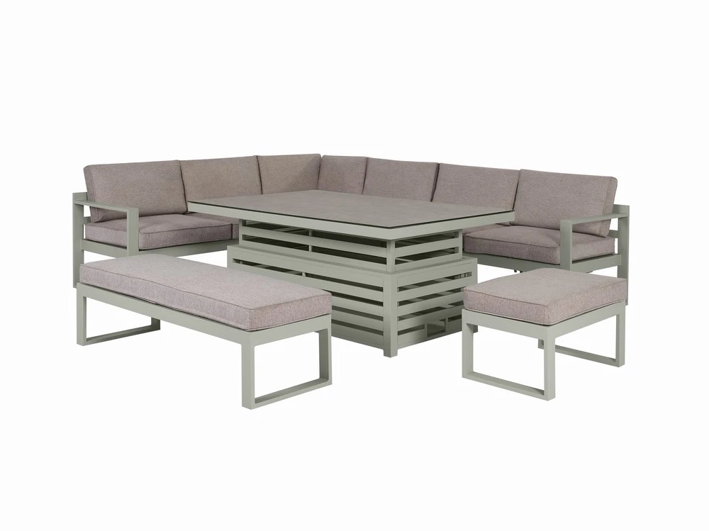 Create a stylish and inviting outdoor retreat with the Orlando Large Corner Dining Set in a serene olive green finish. Designed for both dining and lounging, this versatile set offers the perfect balance of comfort, functionality, and timeless style.