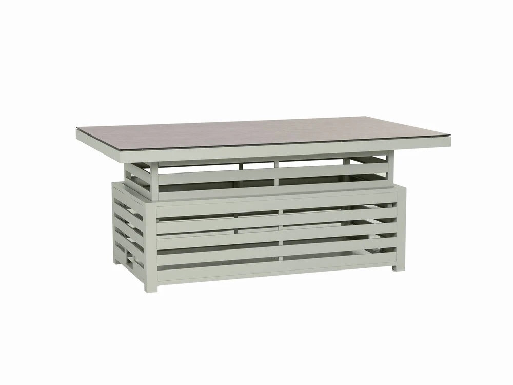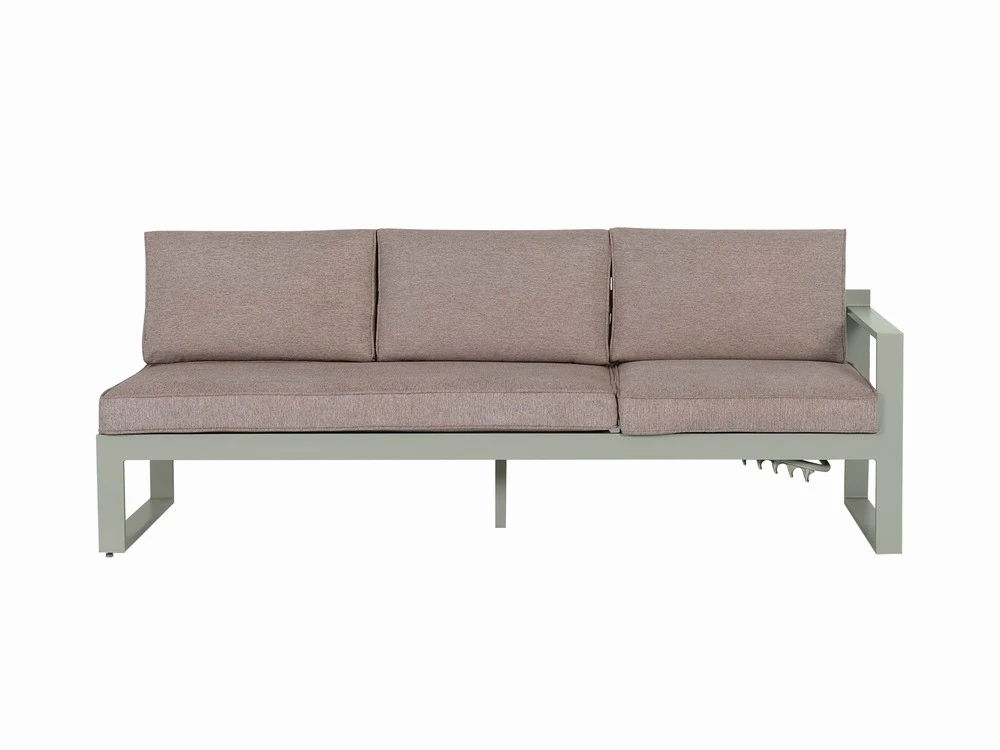 Finished in a calming olive green, this premium set brings together modern design, exceptional comfort, and incredible versatility — perfect for everything from relaxed lounging to elegant alfresco dining. The spacious adjustable-height table shifts effortlessly from a casual coffee table to a generous dining setup, making it ideal for morning coffees, family gatherings, or summer dinner parties. Its durable muted grey-beige ceramic glass top delivers a sleek, sophisticated look, while two matching benches provide ample seating for guests. For next-level relaxation, the corner sofa features hidden built-in sun loungers that slide out discreetly, letting you recline and unwind in total comfort. Plush All Weather cushions and a rust-resistant aluminium frame ensure this set performs beautifully in all weather.