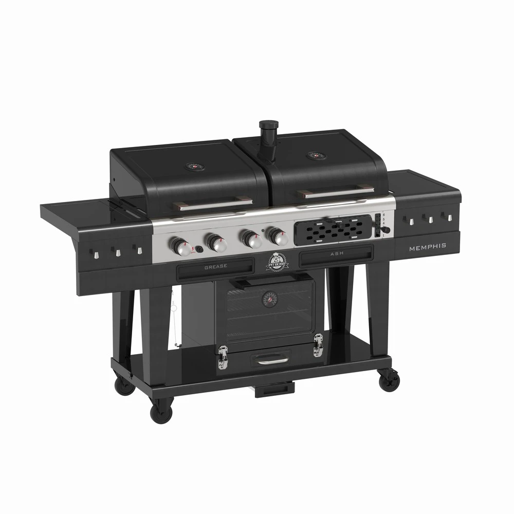The Pit Boss Memphis 2.0 Ultimate Combo Gas and Charcoal BBQ/Smoker PBMEMU2 is the new second generation of the most versatile grill on the market taking all the features of the much loved original Memphis and making them better and easier to live. Not only simpler and easier to build it now features newly beefed up lids, handles and utensil racks, easier to access front drip trays, plus a larger oven with an uprated, easier to access drip tray all sat on top of uprated caster wheels to give additional mobility.