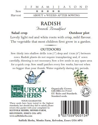 Lovely light red and white roots with crisp, mild flavour. The vegetable that most children first grow in a garden.