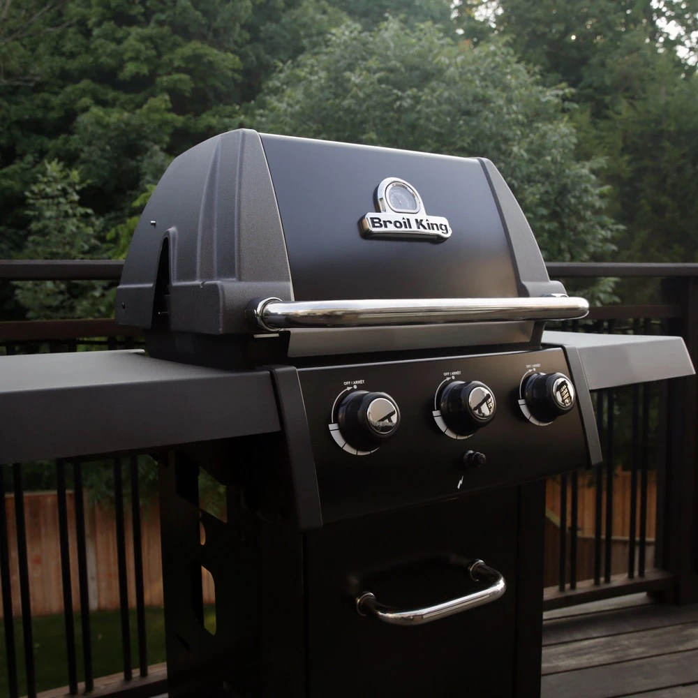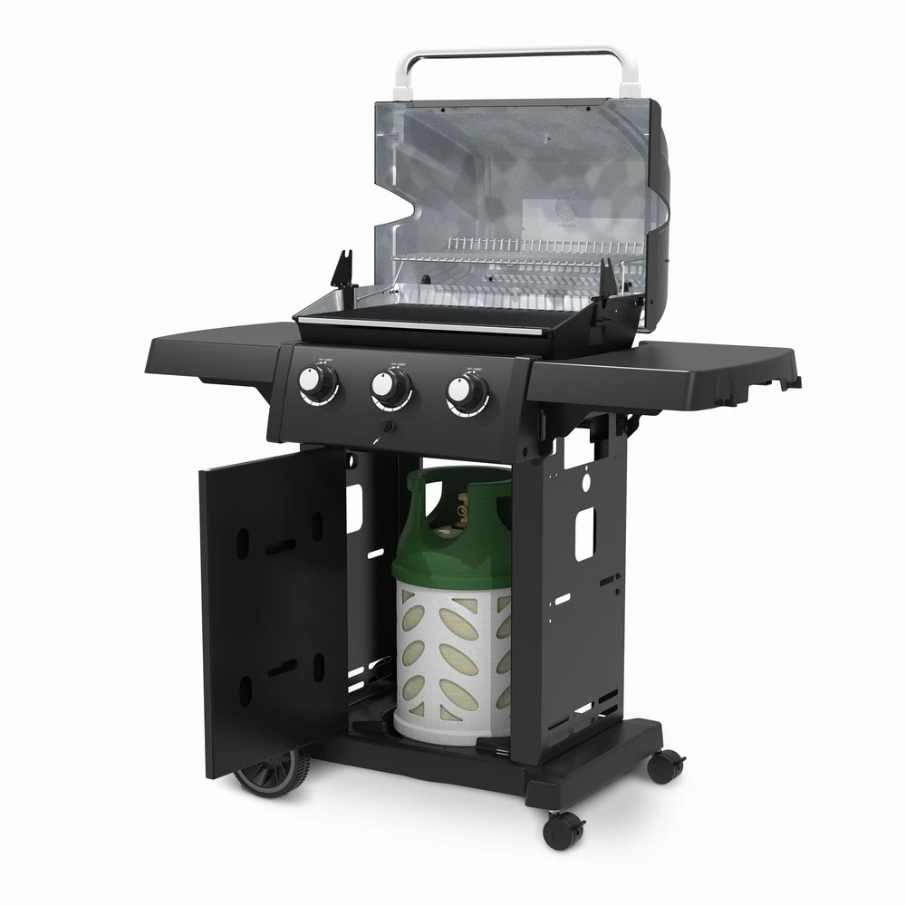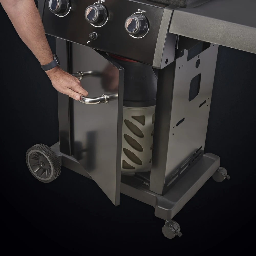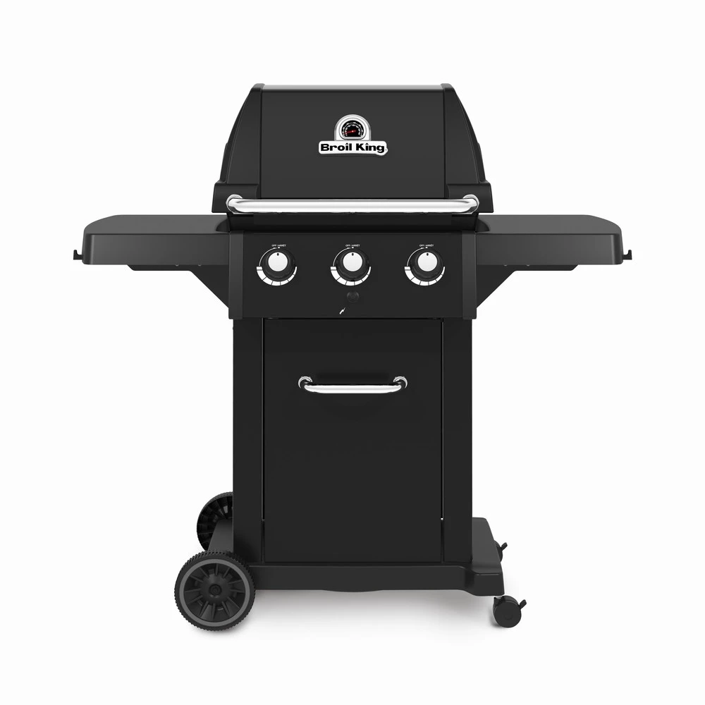 The Royal™ 320 Series features 2,258 sq. cm primary cooking surface and includes 3 stainless steel Dual-Tube™ burners, reversible cast iron cooking grids, stainless steel Flav-R-Wave™ cooking system, and electronic ignition. The Royal™ 320 series features resin drop-down side shelves, and enclosed cabinet base.