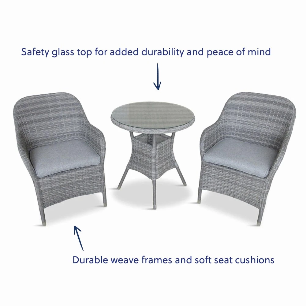 - Crafted with durable weave frames and soft seat cushions, this bistro set combines comfort and contemporary style.