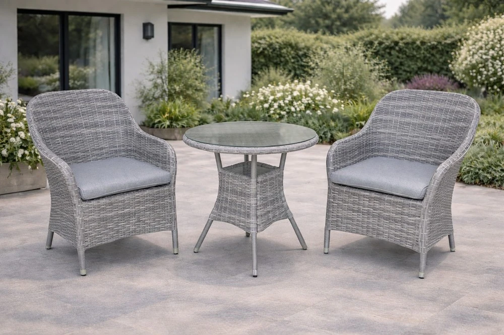 - Finished in modern grey stone and paired with all weather cushions, this set is summer-ready and low-maintenance - ideal for leaving outside in all weather conditions.