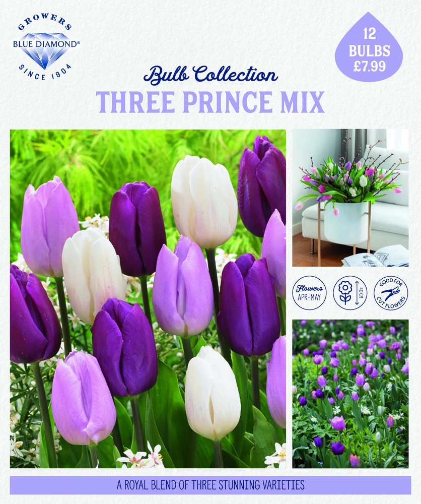 A collection of tulips containing Tulip Purple Prince, Tulip White Prince and Tulip Candy Prince