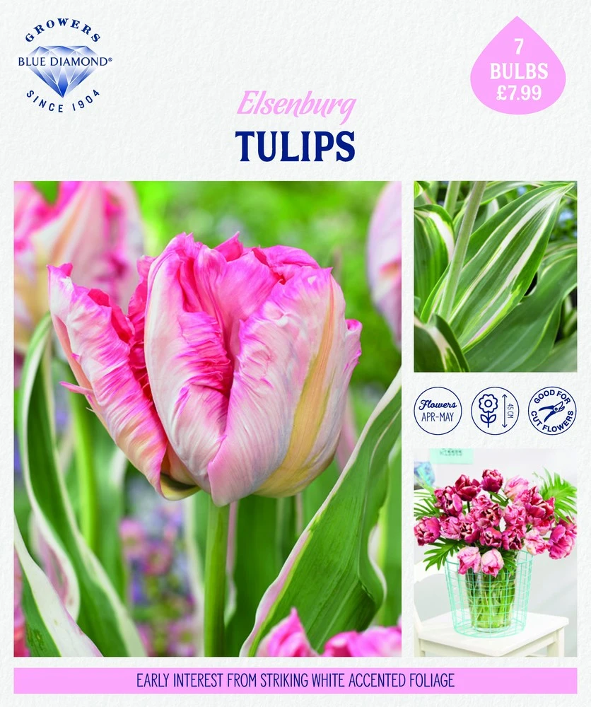 Late-blooming variety that showcase stunning, multi-colored petals. An unique feature is their distinctive foliage; leaves with striking white edges. This tulip is known for their dramatic appearance and delightful fragrance.