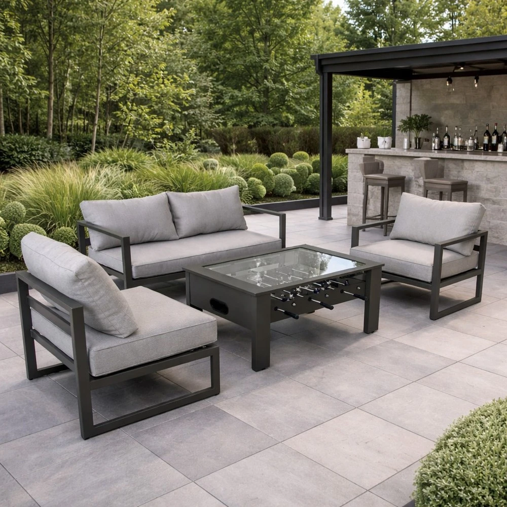 The standout feature of this set is the innovative football coffee table, designed for two players to enjoy a game while seated comfortably. Featuring classic foosball-style players, smooth play action, and a sturdy glass top framed in sleek grey aluminium, it offers both gameplay and practicality for drinks, snacks, and outdoor dining.