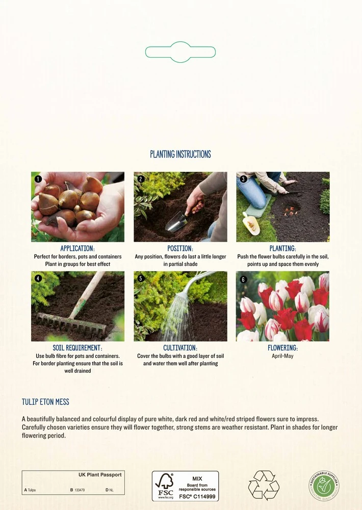 A beautifully balanced and colourful display of pure white, dark red and white/red striped flowers sure to impress. Carefully chosen varieties ensure they will flower together, strong stems are weather resistant. Plant in shades for longer flowering period.