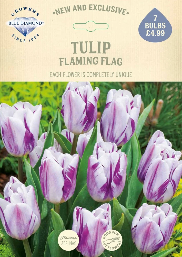 An exquisite and unique Tulip, Flaming Flag with it’s ivory white blooms feathered lavender, each with their own variation. Sturdy weather resistant stems, ideal for beds and borders. Also great for cut flowers as they have a long vase life.