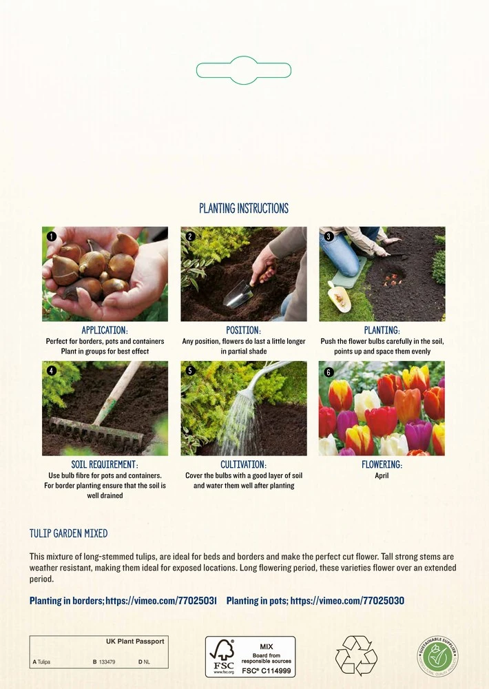 This mixture of long-stemmed Tulips, are ideal for beds and borders and make the perfect cut flower. Tall strong stems are weather resistant, making them ideal for exposed locations. Long flowering period, these varieties flower over an extended period.