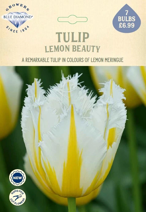 White fringed petals with lemon-yellow that flames from the base of the Tulip and along the centre petals. Tulip Lemon Beauty is an exquisite fringed Tulip, the crystal edge adds to its beauty. Great for borders or growing in containers and perfect for cutting too.