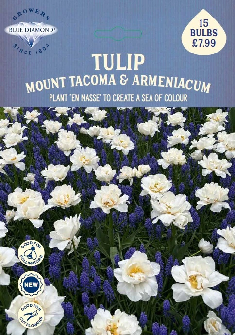 The elegant, pure white double blooms of Tulip 'Mondial' combined with a sea of blue Muscari Armeniacum. This delightful spring bulb pairing adds a burst of vibrant colour to your flower beds and containers. For a stunning effect, plant them in large groups throughout garden beds or cluster them in patio pots.