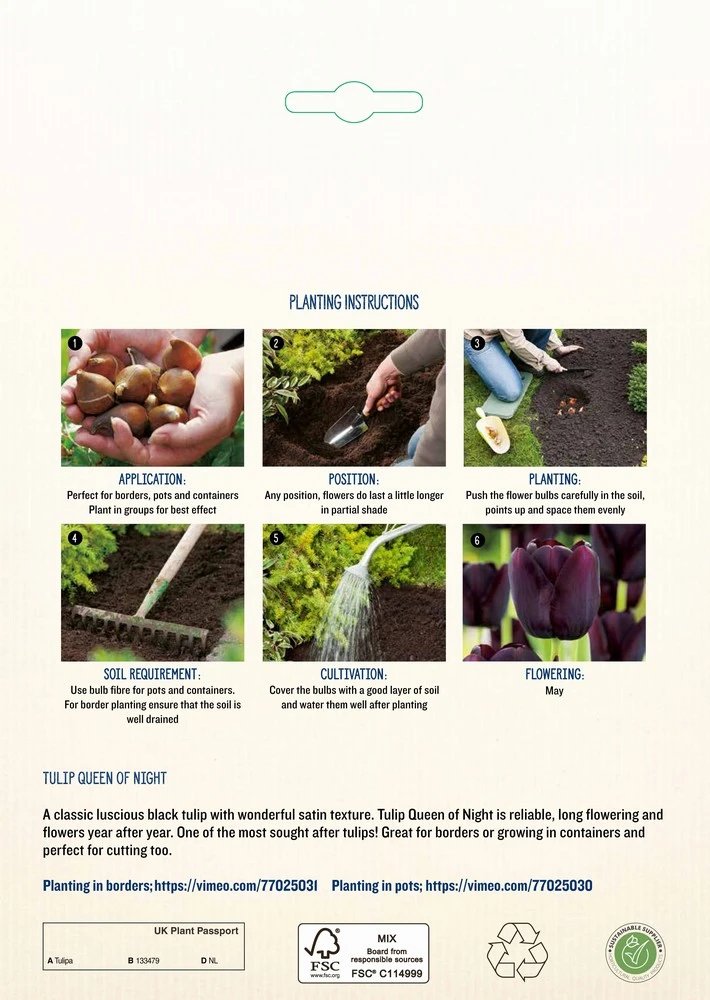 A classic luscious black Tulip with wonderful satin texture. Tulip Queen of Night is reliable, long flowering and flowers year after year. One of the most sought after Tulips! Great for borders or growing in containers and perfect for cutting too.