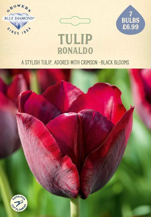 Triumph tulips are single flowers with the classic tulip shape. Tulip Ronaldo has deep carmine-crimson blooms, darkening nearly to black at the base. A stylish addition to borders and containers, adds depth to the typically brighter colours in a spring garden bed. Great for growing in containers too, and Ideal for cut flowers.